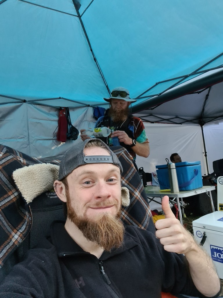 Come race morning I wake wrapped in my sleeping bag, hearing the rustling of others around the campsite encourages me to move and ready myself for the day ahead. I eventually brave the cold morning and upon opening my tent I realise darkness is still set in and there is a sheet of ice covering the tent. This is most likely one of the reasons why I was freezing throughout the night.