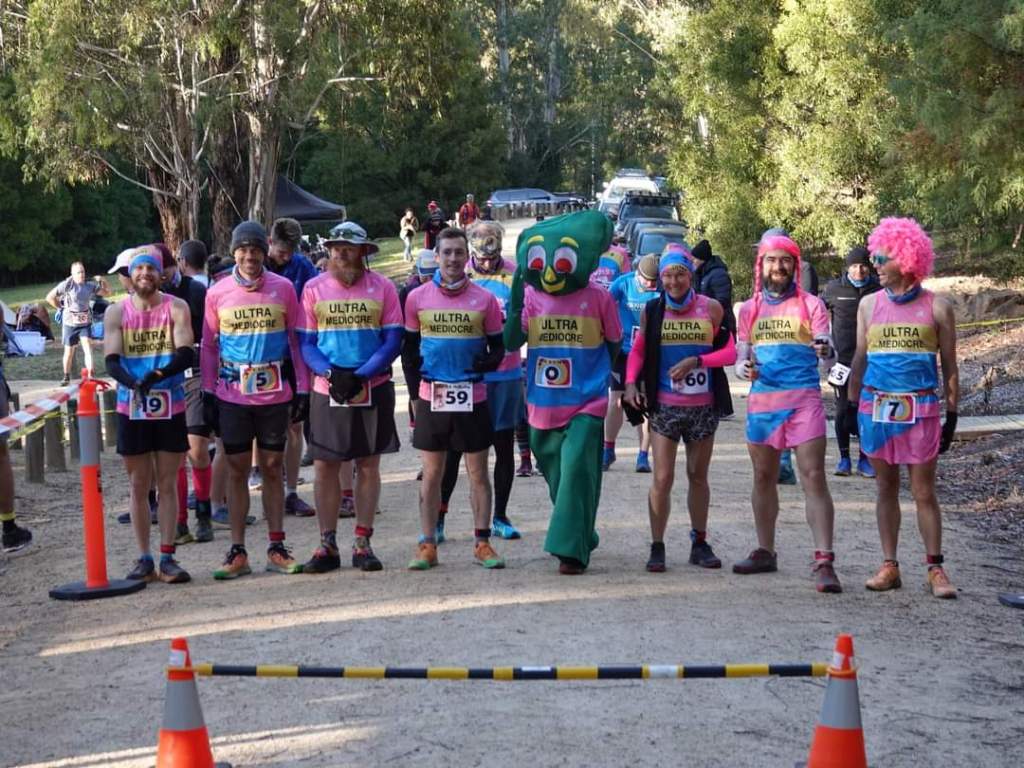 Before long, the clock ticked over to 7:45am and the race director Aaron Broughton began the countdown to the start inaugural Great Ultra Mediocre Back Yarder. I swiftly changed out of my warm clothes and donned my running gear, the iconic UMROC running singlet with its bright pink, yellow and blue. I line up at the front of the start line with my UMORC comrades, the brisk cold washed over my skin and smiles were plastered on everyone’s faces.