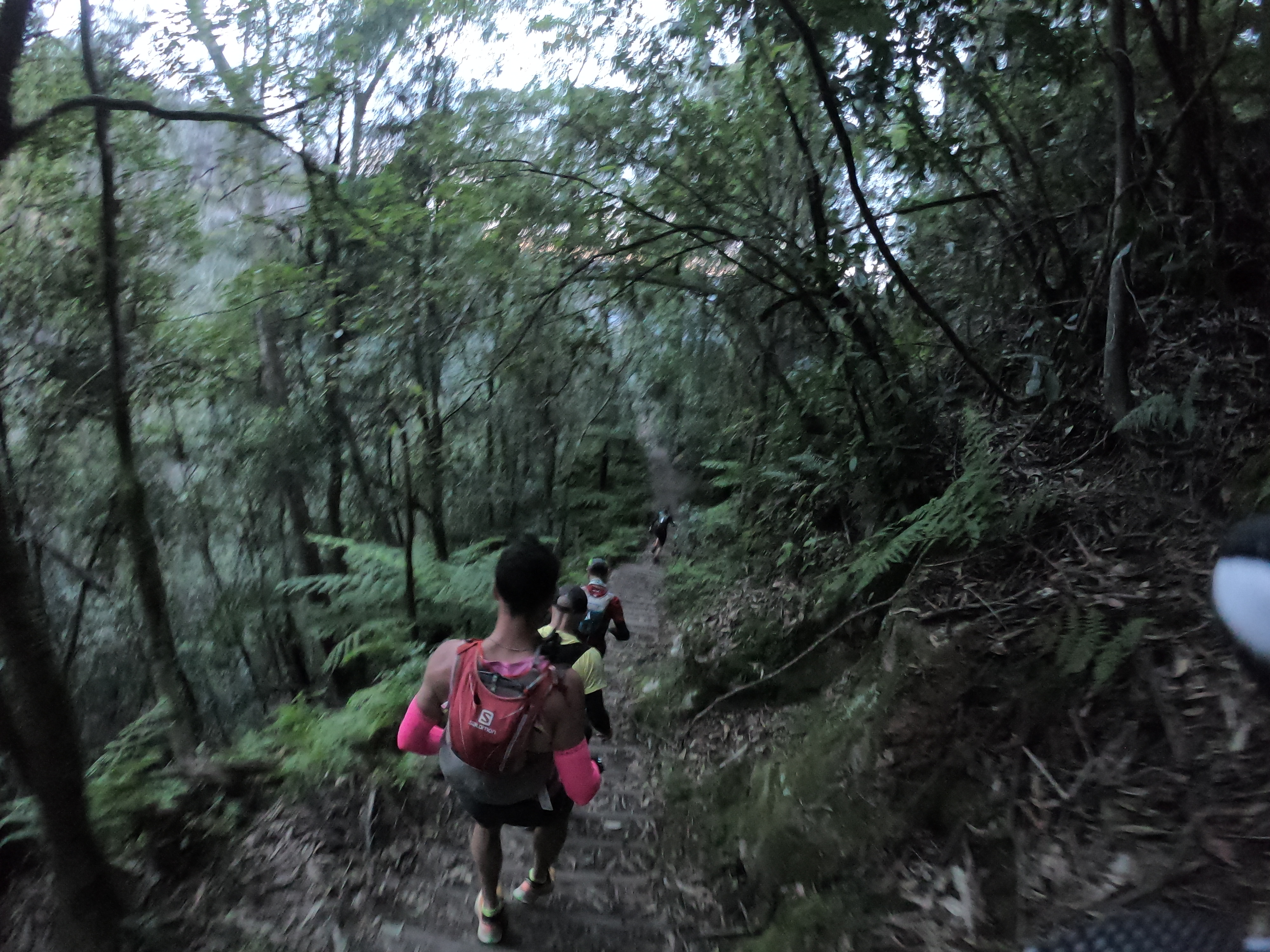 The cheering fades and I can see sunlight peeking over mountains from within the dim forests. The noises are reduced to the sounds of shoes briskly stepping down stairs, runners wishing other runners’ luck, and the magical forests. A bundle of joy wells up inside, a smile is spread from ear to ear and I yell out a loud “Wooooooooooo!” happy to be alive. Before long Chris and I arrive at the landslide a 300 metre stretch of rough terrain which in some parts are a scramble. After carefully making our way through the landslide we continue further into the magical forests where I ask Chris “Are you up for running the entire 100km together?”, with a big smile Chris responds “hell yeah”. We reach the Golden Stairs 200m of elevation worth of stairs. As we are climbing I spot Lucy Bartholomew at the top of the stairs. We exchange a smile and she compliments my brilliant running shorts. We summit the Golden Stairs and continue onward up a steep road and meet open fire trails.