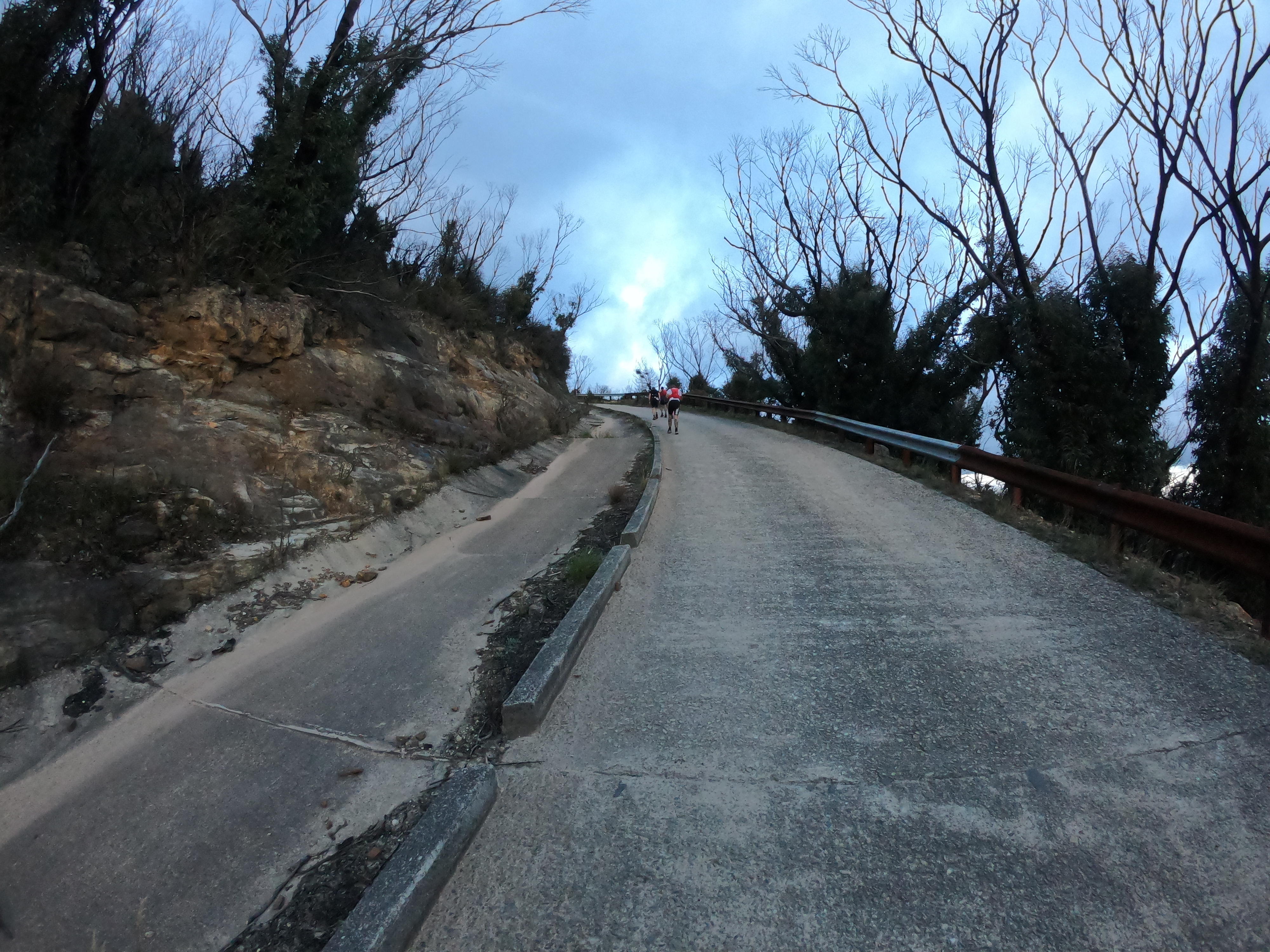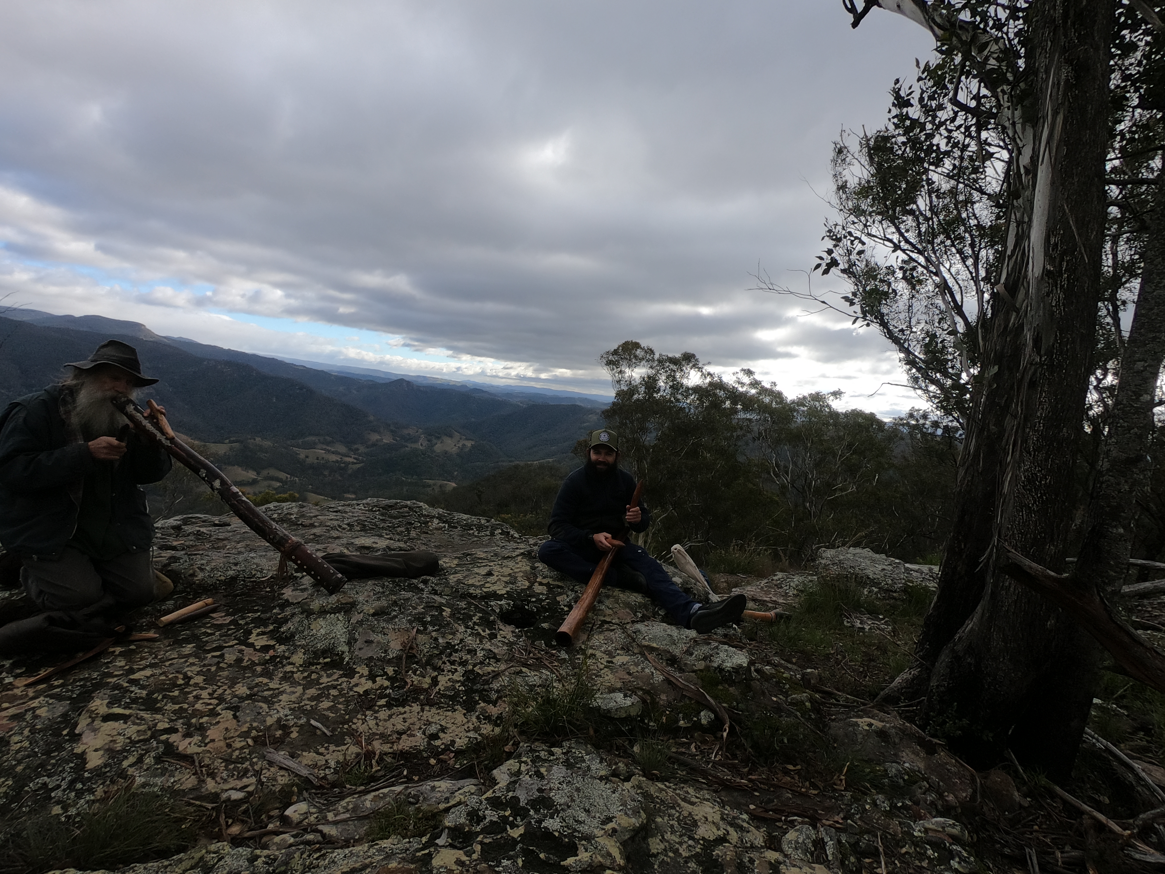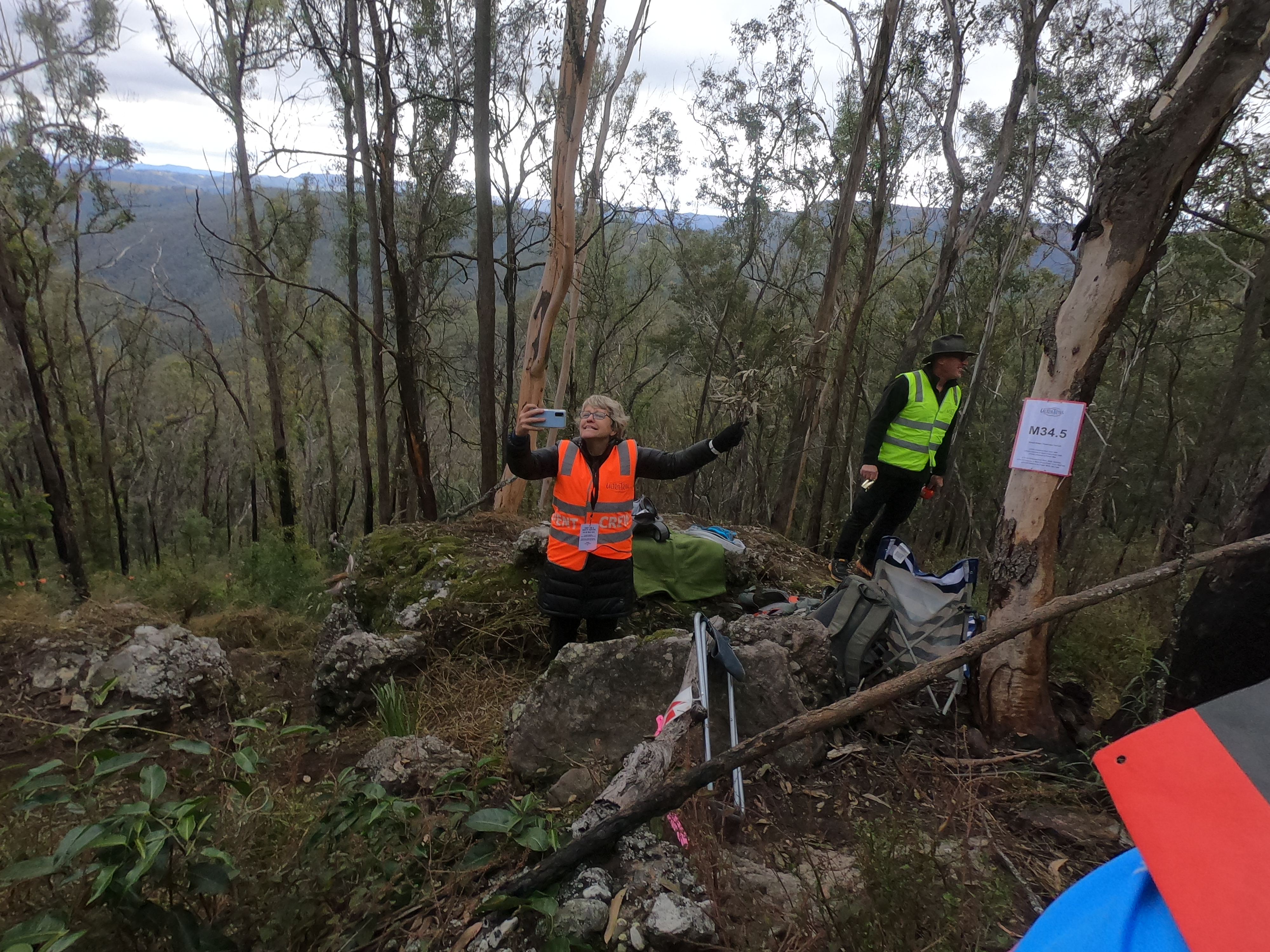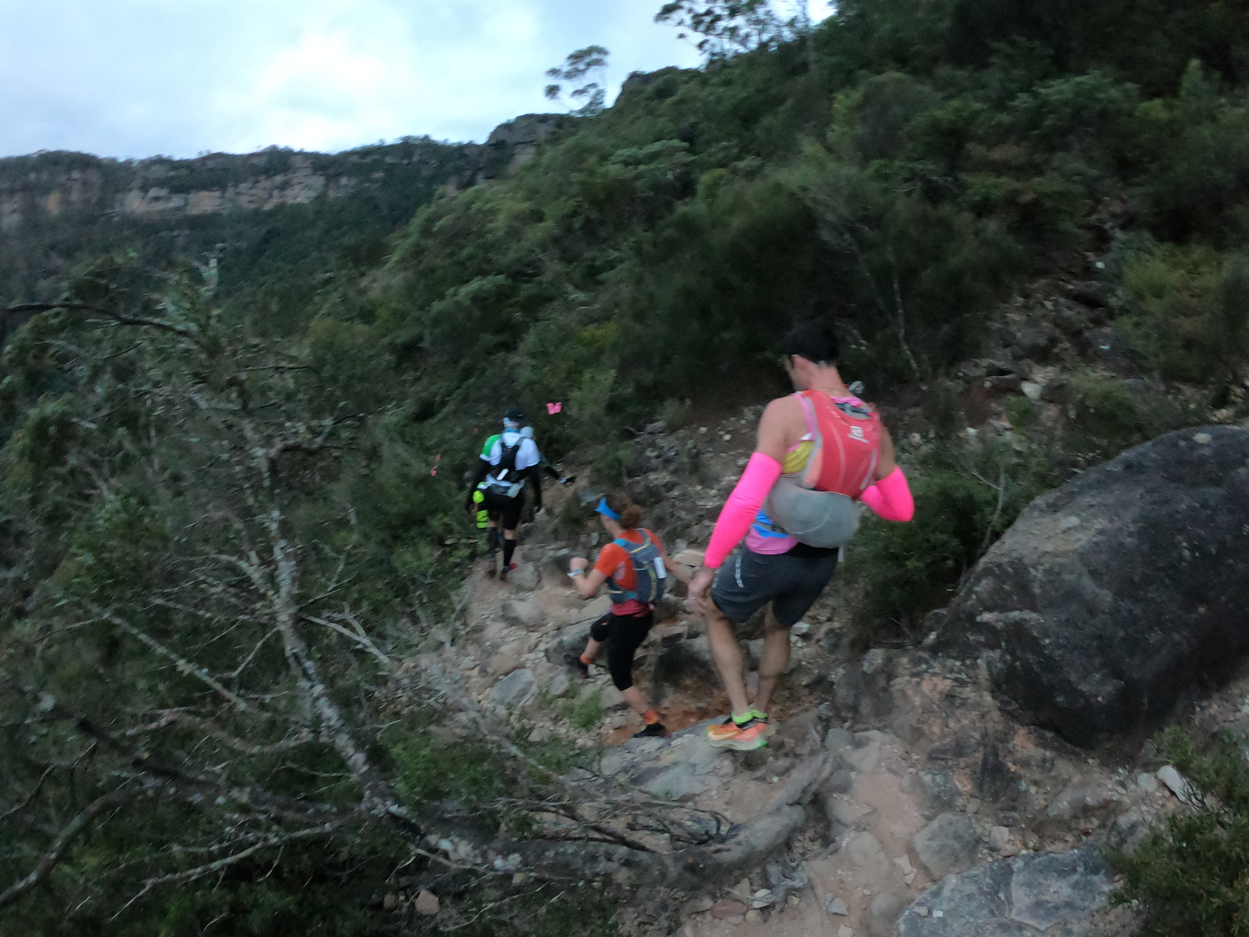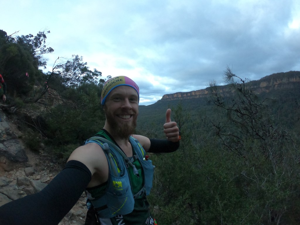 A refreshing wave flows over me and I feel reenergised as Chris, Romain and I continue running together. Together we run through the next 3km of mostly single track and upon approaching Iron Pot Ridge (34km) I yell out a loud “Woooooooooooo!”. I quickly receive a distant “Wooooooo!” from my mother, Jane Hiatt, who volunteered over 8 hours of her time out at Iron Pot Ridge directing every single runner who passed. Iron Pot Ridge is another iconic part of the UTA 100km, indigenous people are playing didgeridoos and tap sticks welcoming us onto their land as we run across enormous boulders overseeing dangerous drops on both sides. I pass my mother on the way out of Iron Pot Ridge, we share smiles and more shouts of excitement as I descend a near vertical drop of dirt single track. We leave the single track and onto fire trails deep in the bushlands of the Megalong Valley.
