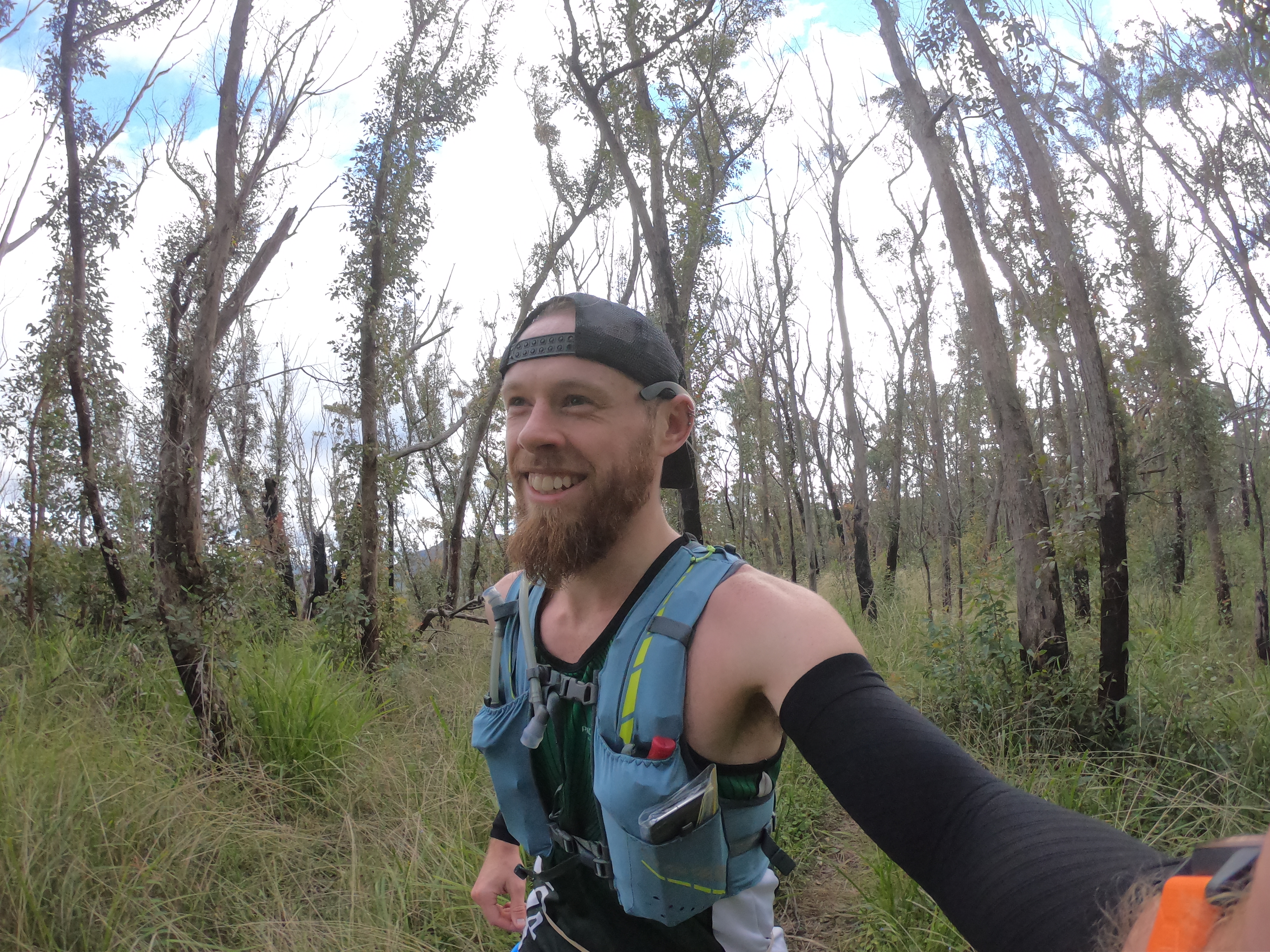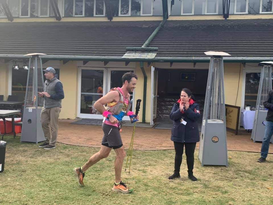 I give everything a pass as I stroll through Checkpoint 1 and wave to the volunteers. This is when I notice Chris is a little behind me and I slow my pace allowing the race duo to come back together. With Chris leading we continue along the open fire trails passing the 18.4km marker and then descending a ladderway, rough terrain and single track to Tarros Ladders (21km). Tarros Ladders is an exposed cliff face where extension ladders are attached and surrounded by ropes, it is only available to climb during the UTA. From memory this was my first time climbing these iconic ladders, due to the congestion at my previous two races I decided to use the authorised alternate route. The heaviness in my legs from the GUMBY was evident at this stage but I courageously slapped on a smile and carried on running while Chris and I chatted and share memories from previous races. In no time we reach Checkpoint 2 (Foggy Knob – 32km). The checkpoint is spread out around an open field, marquees set up with food and a water station. I grab pieces of watermelon and bananas, and fill up my two front water bottles. I mentally check in with my body, feet are good, stomach is good, energy is great and my quads were now feeling better than earlier. Chris and I meet Romain Richard running his first 100km (finishing in 11:43:10) at Checkpoint 2.