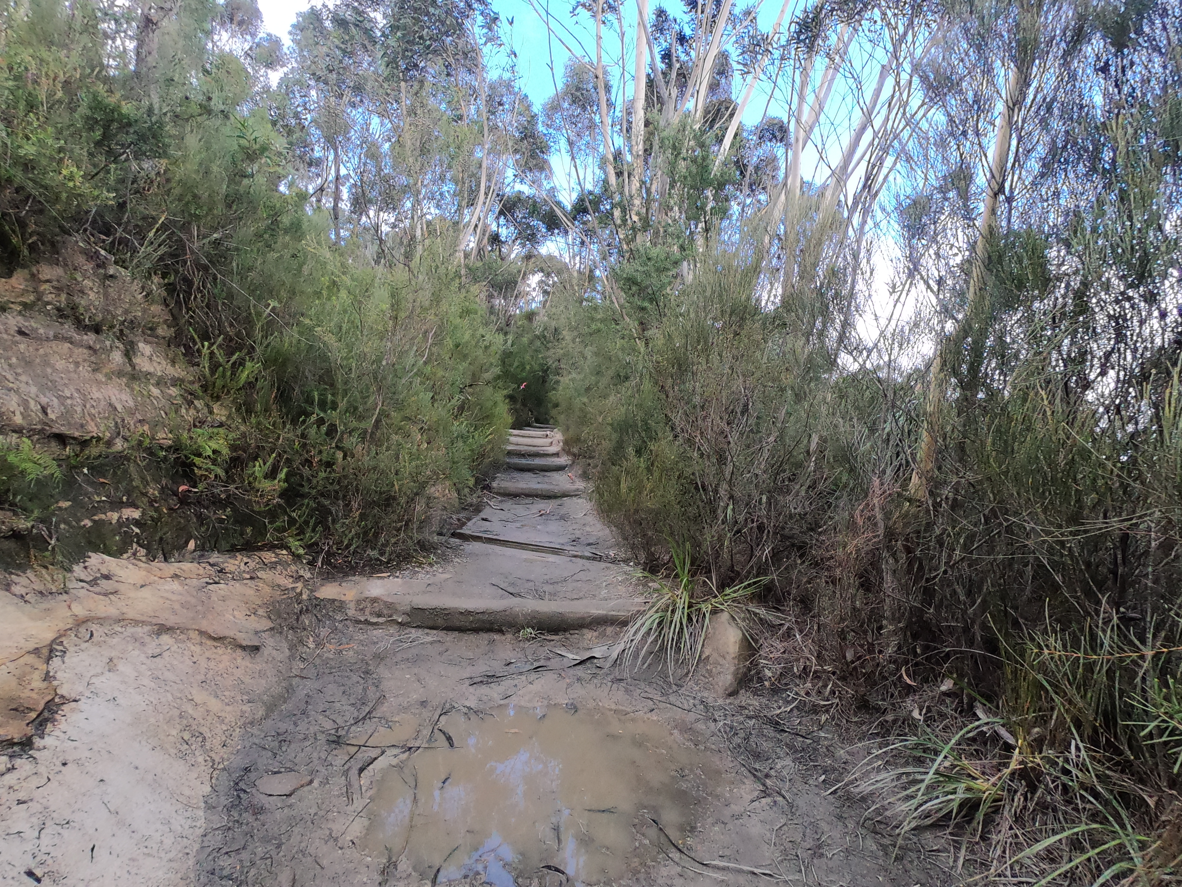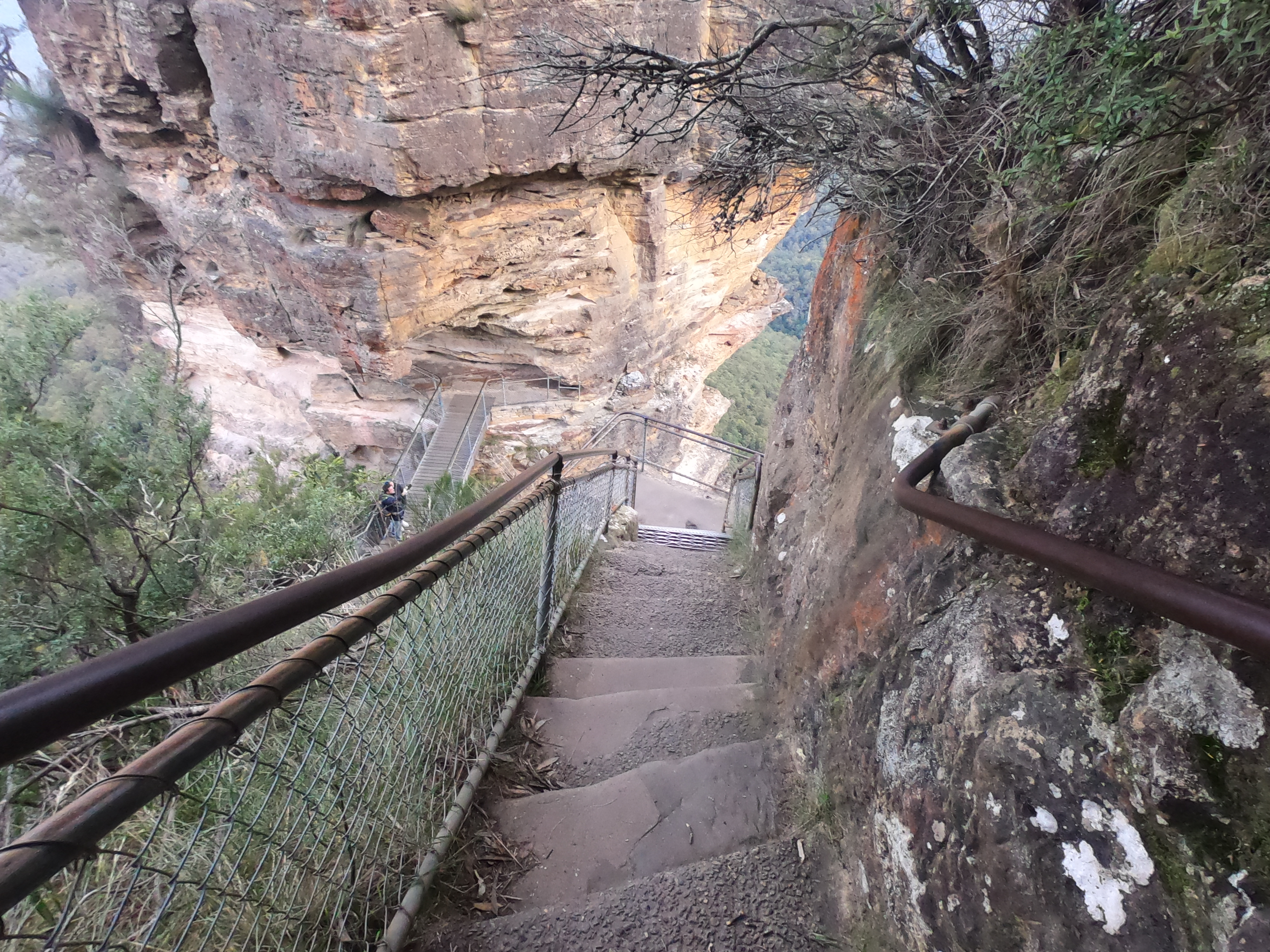 Chris and I leave Checkpoint 4 and are immediately met with a blast of cold winds sending shivers down my arms. We run briefly on foot paths and then to trails until we meet back up with scenic world where we take a left in the fork linking in with the 50km course, earlier that day we took the right in the fork. I check in with how my body is feeling, energy is good, mentality is good and legs are feeling strong despite the fatigue. As Chris and I run over the boardwalks to the Echo Point Lookout I smile and wave to walkers some responding with a smile back and others with confusion washing over their faces, we make quick work here and then descend the Giant Stairway into Leura Forest. I descended these steep stairs with little thoughts for my safety, I knew my body was safe, looking up I could see the vast mountain scenery and it is still beautiful as it was earlier. Leura forest is magical and ever moment I spent in the forests imbued me with uplifting energy, as we ran through the magical forest I yell “Woooooooooooo!” followed by singing about the magical forest.