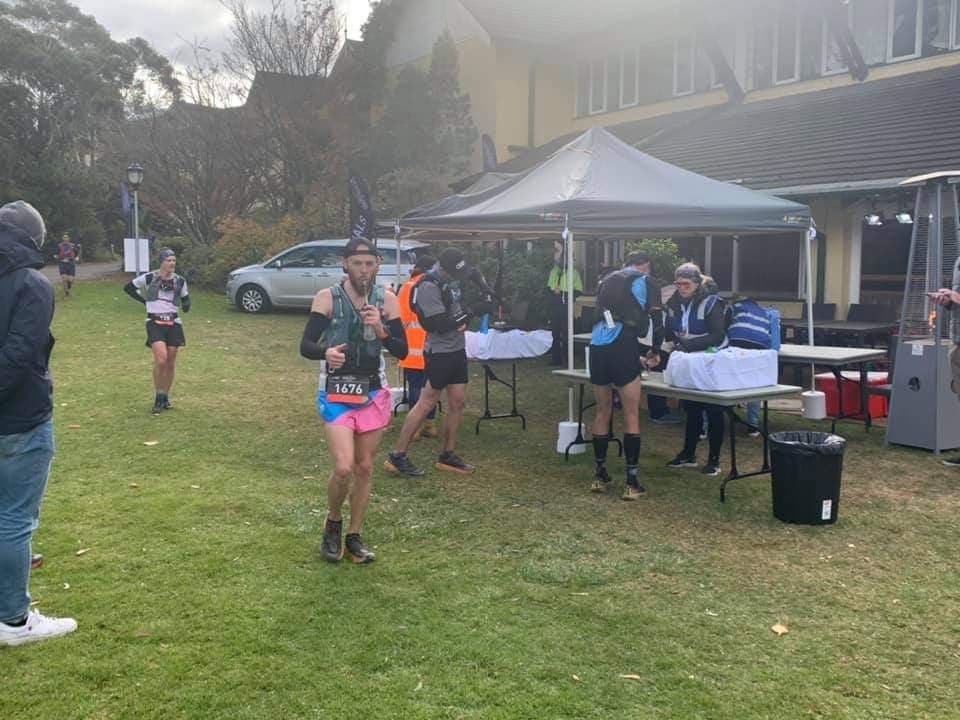 I notice Chris pulling back and I follow suit, he tells me he is suffering from cramping and I reassure him we are in this together. We alternate walking and running through fire trails, single track and river crossings until we reach Checkpoint 3 (Six Foot Track – 45km). This checkpoint is the first of the larger checkpoints with access to drop bags. Marquees are up, food is plentiful and crew/spectators are all around. I smash down several pieces of watermelon, bananas and a packet of chips, sit down with Chris and his family (wife Carly, mother Joe, father Mark and younger brother Shaun). We all share smiles while I restock my spring energy gels and carbohydrate drink, tailwind.