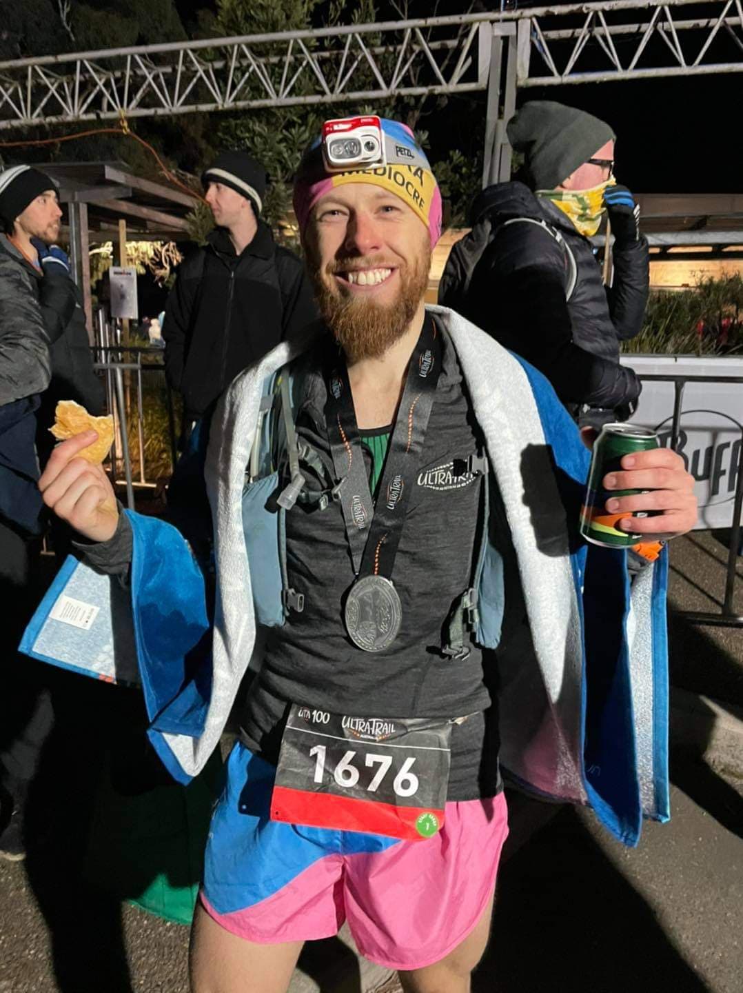 I now know we are getting much closer to the finish, I feel a surge of energy hit me and I push on a little harder than previously on the fire trails. I push upwards my light illuminating 50km runners ahead of me, they pull to the side to let Chris and I through and I wish them well on the rest of their run. A smile runs across face and I begin singing about magical forests while loosing awareness of my out surroundings, I am now focused on the way ahead and ensuring Chris stays with me. From my view it seemed Chris was suffering in his own way, keeping to himself and moving forward. I was looking back every now and then to make sure Chris was still there, then I caught a smile from him… after seeing that smile, I knew Chris was solid as a rock, a mighty warrior full of courage in the face of battle. I didn’t look back again, rather I just listened for his poles and footsteps sticking to my heels. This next section of single track seemed to fly past as Chris and I pushed strong on the uphills and run consistently on the flatter trails, we pass many 50km runners and a few 100km runners. I shout cheers of encouragement as we pass these runners and then run up behind Andrew Pearce (Finished in 12:51:08). Andrew leads our train of three runners as we run up stairs, around trees and through a magical forest. More shouts of encouragement are sent to the runners we pass, I let out a loud “Wooooooooooo!” feeling so alive and exhausted. Andrew pulls over to let Chris and I lead, we respond in kind and keep up the pace. The final markers start showing up, 5km to go, 4km to go, 3km to go and at 2km to go, I am feeling light headed and a little dizzy. I knew what this was, it was my body telling me it was depleted of glucose. After my 50km effort at Duncan’s Run I told myself I would never let myself get like that again in a race. I turn around asking Chris if he can spare some food, he pulls out a bag of gummy bears, I grab a bunch and shove them into my mouth chewing lots in an effort to bring my glucose levels back up. Looking back forward my gaze is only up, up the stairs ahead. On foot in front of the other, holding onto the railing next to me I use it to help pull me upwards. Next thing I know we are at the Furber Steps, 1km to go, I make a hard right straight up the steep stairs and push on. 951 stairs later Chris and I summit the Furber Steps. Our pace quickens as our feet touch the board walk, like gazelles we leap up the final few stairs and then we turn up the heat for the final push up the finish line chute. My ears flooded with cheers from the crowds as Chris and I crossed the finish together. Both our legs came to halt, we looked at each and embraced in a hug. With pride welling up in me I was greeted by my mother and personal trainer Kristy as I walked out of the finish line area. Shaun also greeted me with a congratulatory beer, the golden liquid was sheer bliss to my lips.